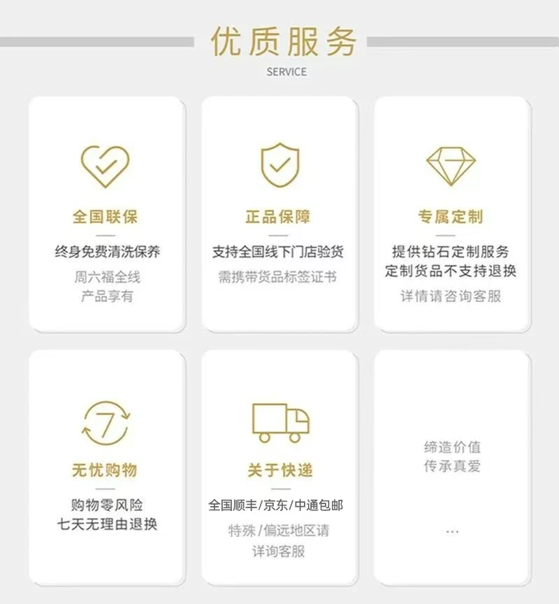 另外,周六福也有非常好的售后服务保障:终身免费清洗保养,支持全国线下门店验货,全国顺丰/京东/中通包邮,以及七天无理由退换!