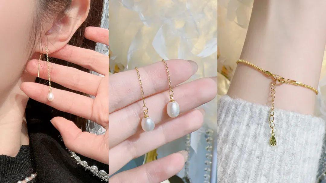 除了项链以外,还有配套的手链和耳坠,都是金色链条+珍珠的设计,简约又有看头,是那种一看就搭配得很有腔调,但又不会过分抢眼的设计。