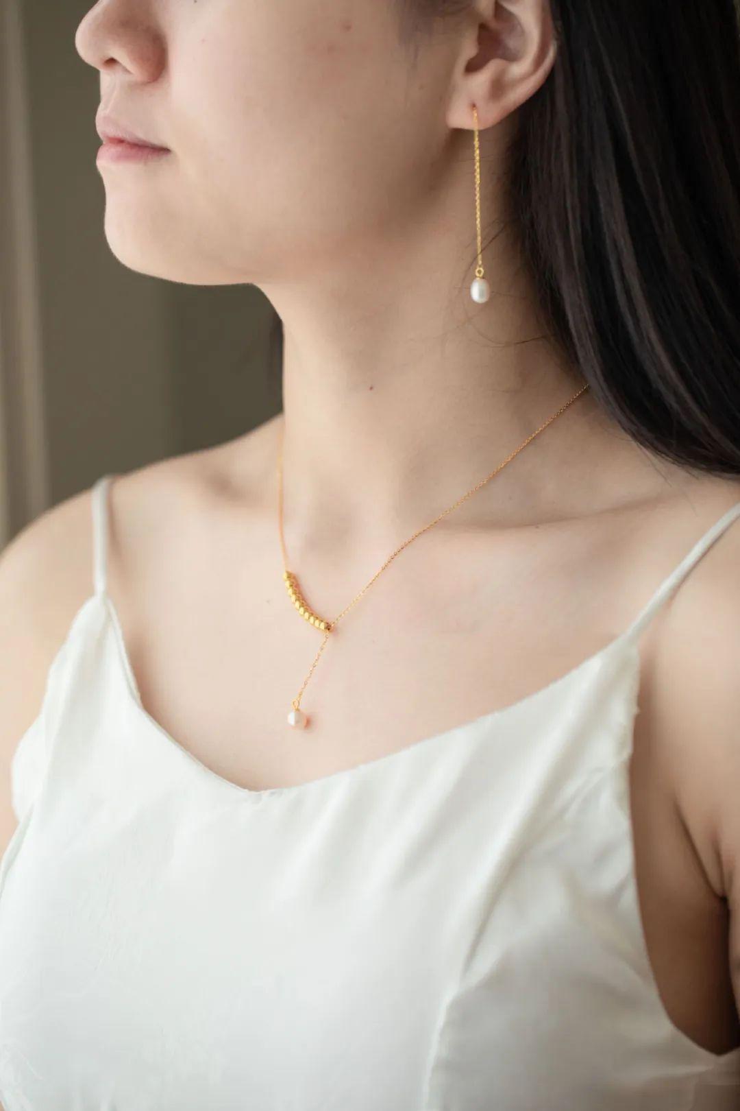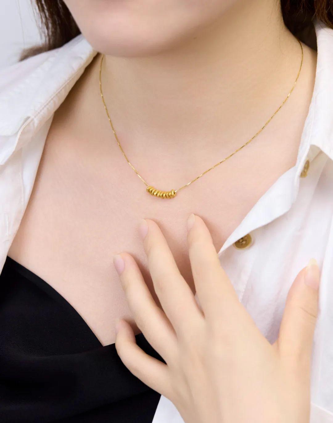 一颗颗足金碎金子落在颈间,一点都不刻意,但真的很显气质,而且无论是国风还是时髦的现代风都能很好地适配。